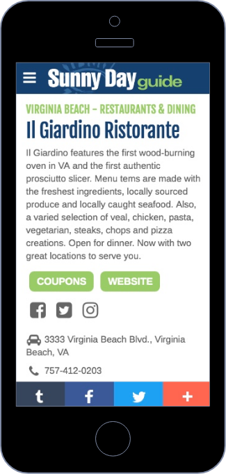 Along with the purchase of a 1/4-page or larger Sunny Day Guide ad, your business is showcased to visitors worldwide with your own Personalized Profile Page on SunnyDayGuide.com including: